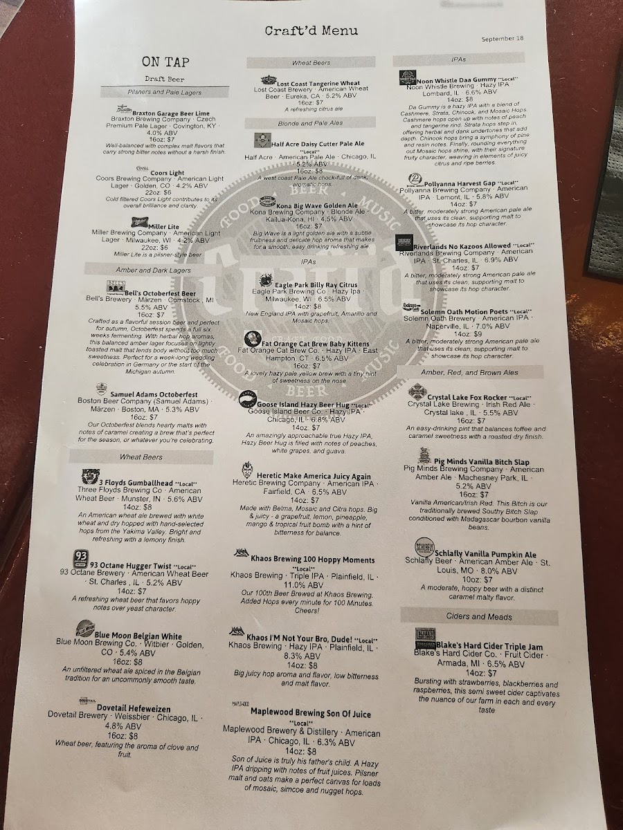 The cocktail selection is just as enticing, with unique offerings like the Pineapple Express and Espresso Martini, perfect for elevating your dining experience. Guests love the friendly service, with highlights including dog-friendly options on the patio and an accommodating staff eager to make your visit memorable. With a great variety of dishes and an inviting atmosphere, Craft'd is not just a meal but an experience worth savoring.